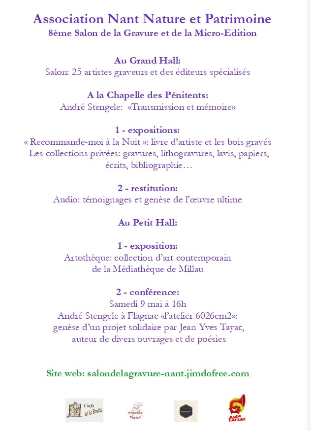 On pourra découvrir à La Chapelle des Pénitents «Recommande-moi à la Nuit » l’ultime livre d’artiste, bois gravés d’André Stengele et poème de Jean-Yves Tayac, en édition limitée sortie début 2026 et l’exposition de collections privées : gravures, image/papier, écrits, photographies témoignages, document sonore.